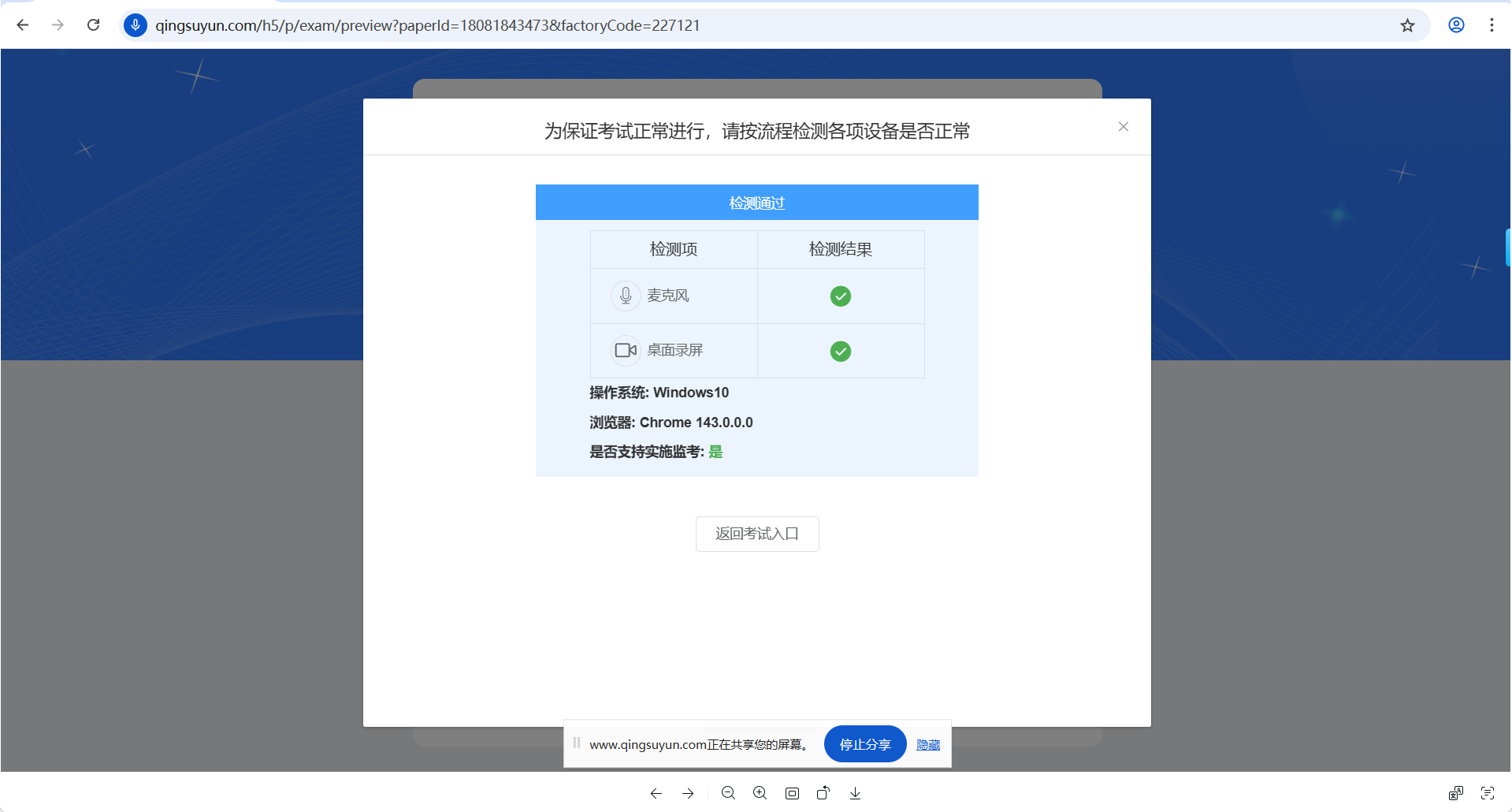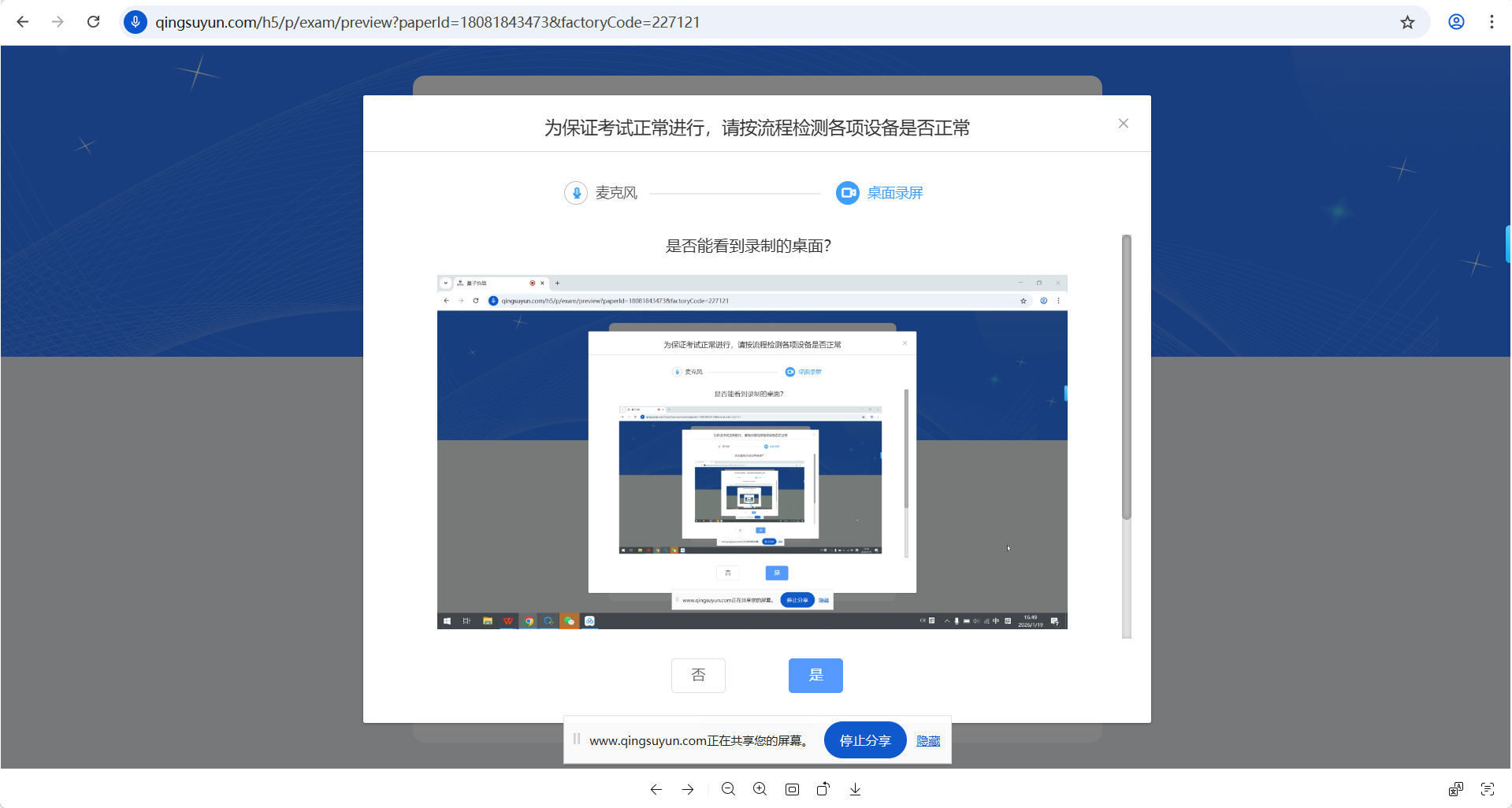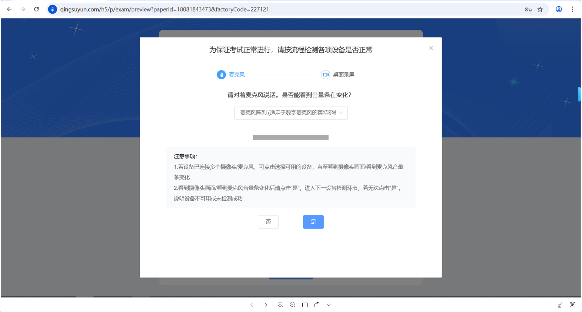 3、按系统提示完成考前设备检测,包含麦克风、摄像头、桌面录制; 如下图2-5