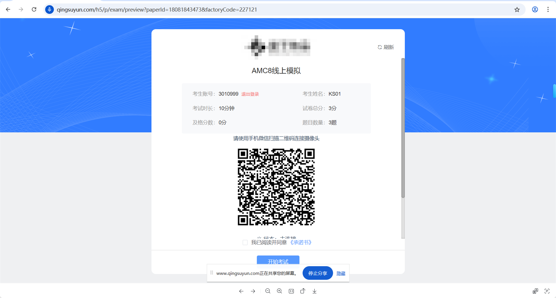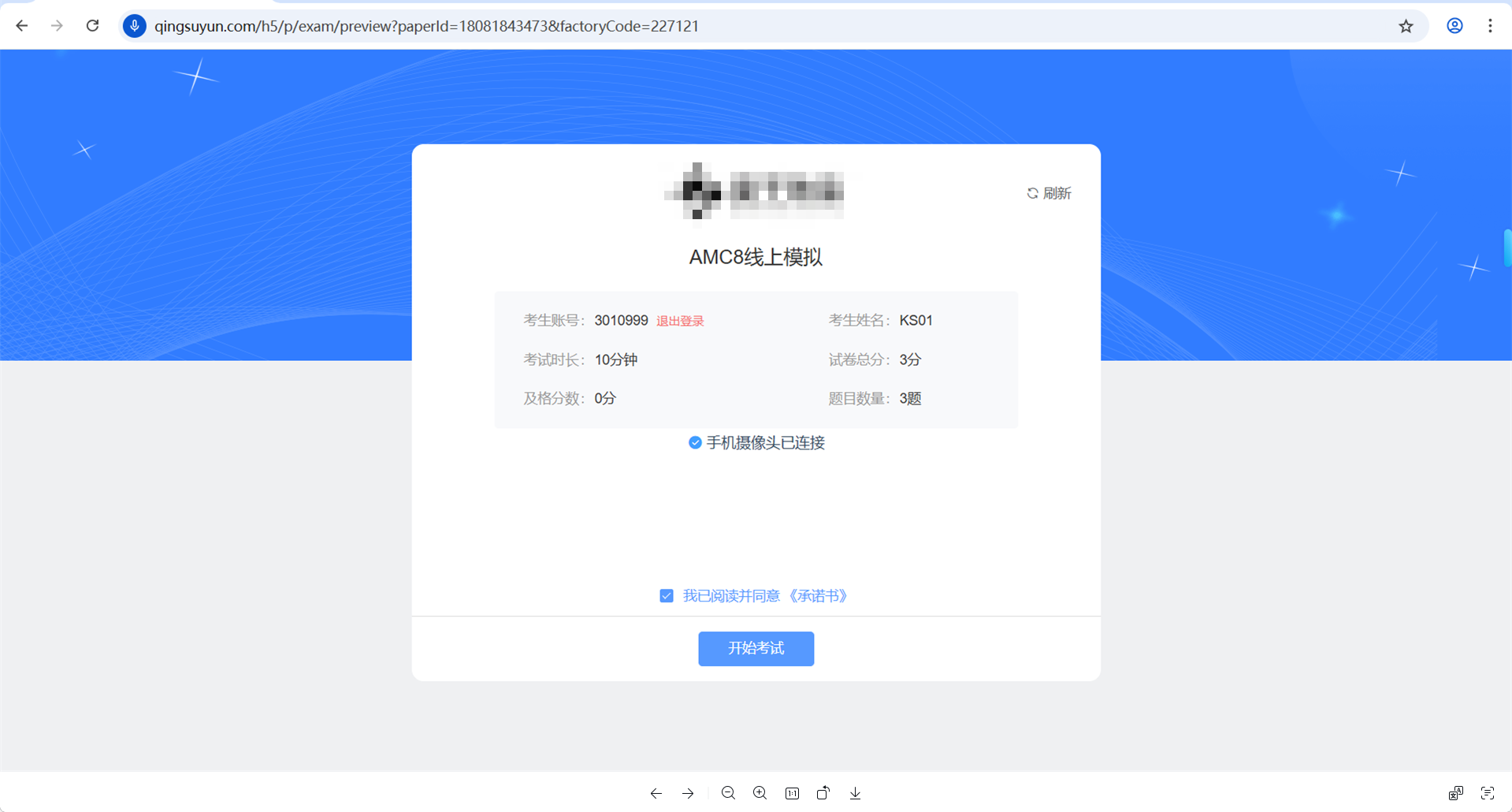 5、第三视角成功链接后,将显示手机摄像头已链接,请保持网络稳定;勾选《承诺书》,点击开始考试;若未到达考试时间,将会进入等候页面,考试开始时,系统将自动跳转至考试页。 如下图8