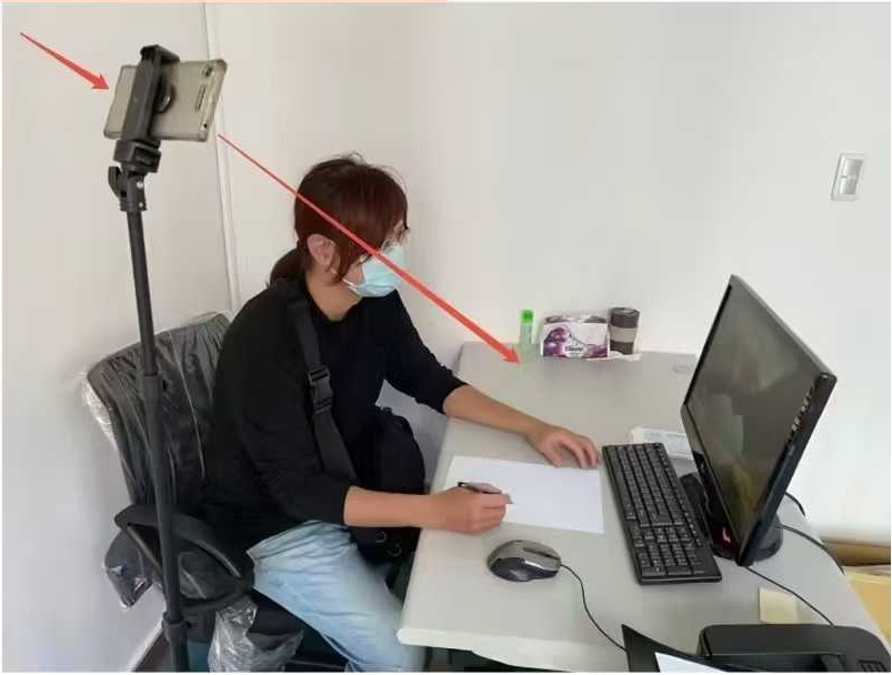 4、使用准备好的第三视角监考手机打开微信,扫描考试系统中二维码,在监考手机中启用监控,并按要求将监考手机架设于考生侧上方,监考手机画面应包含完整考生、桌面、电脑屏幕; 如下图5-7