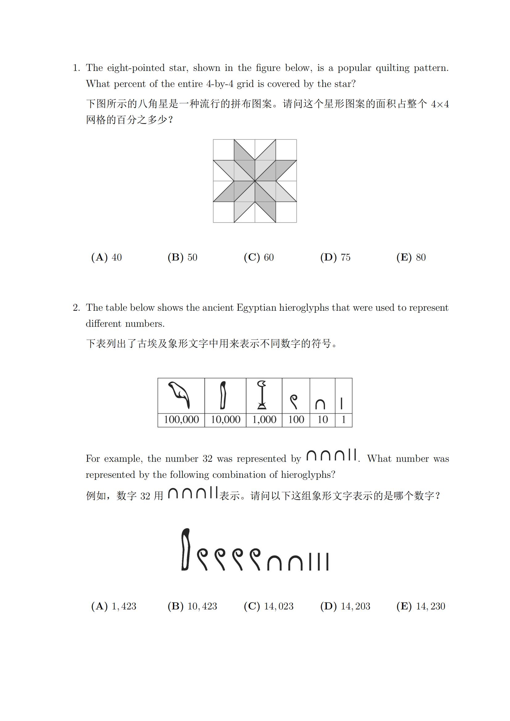 美国数学协会(MAA)官方主办,成绩获全球顶尖中学、夏校及权威竞赛体系高度认可; 聚焦8年级及以下青少年数学素养培育,吸引全球超60个国家和地区数学爱好者同场竞技; 采用低门槛、高包容的赛制设计,兼顾不同水平学生能力发展需求,助力其在挑战中感知数学学科魅力; 同步提供中英文双语试卷,有效消解语言障碍,确保学生专注于数学问题的深度探索与逻辑推演。